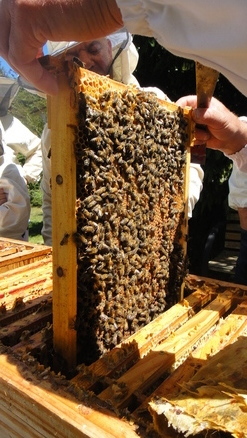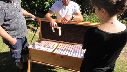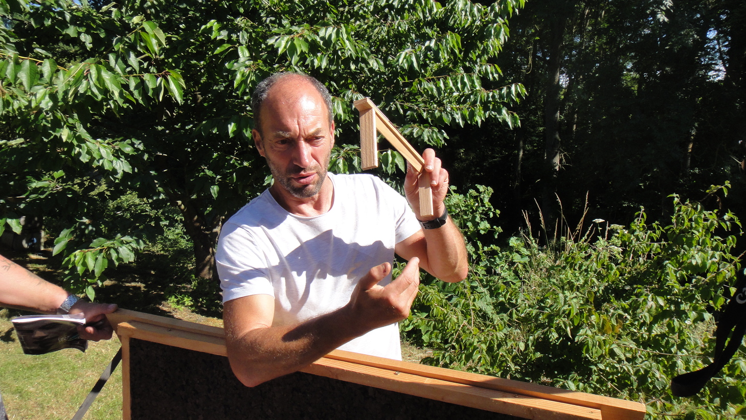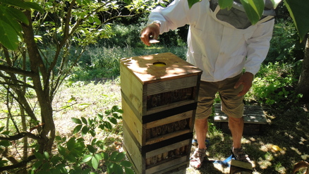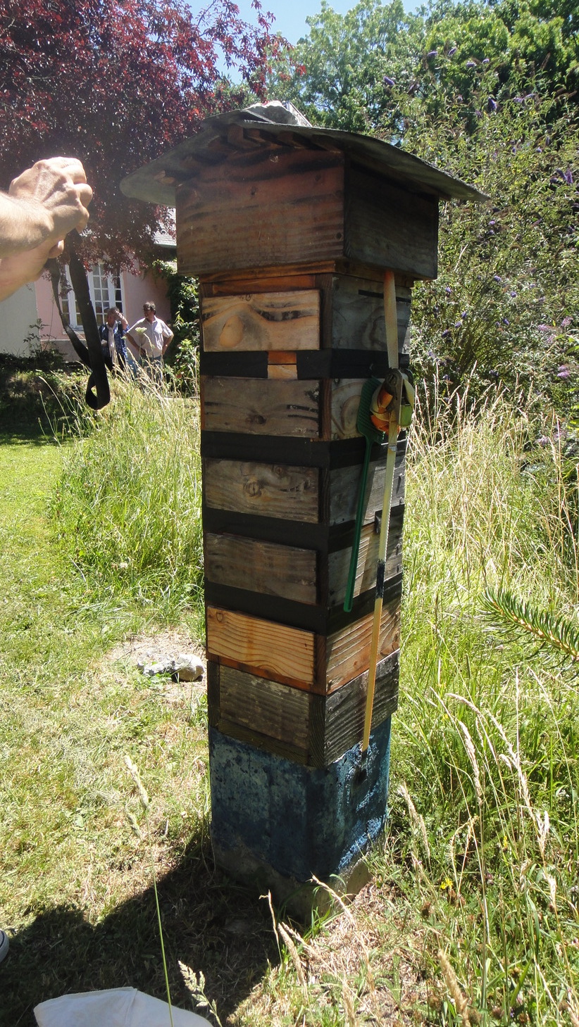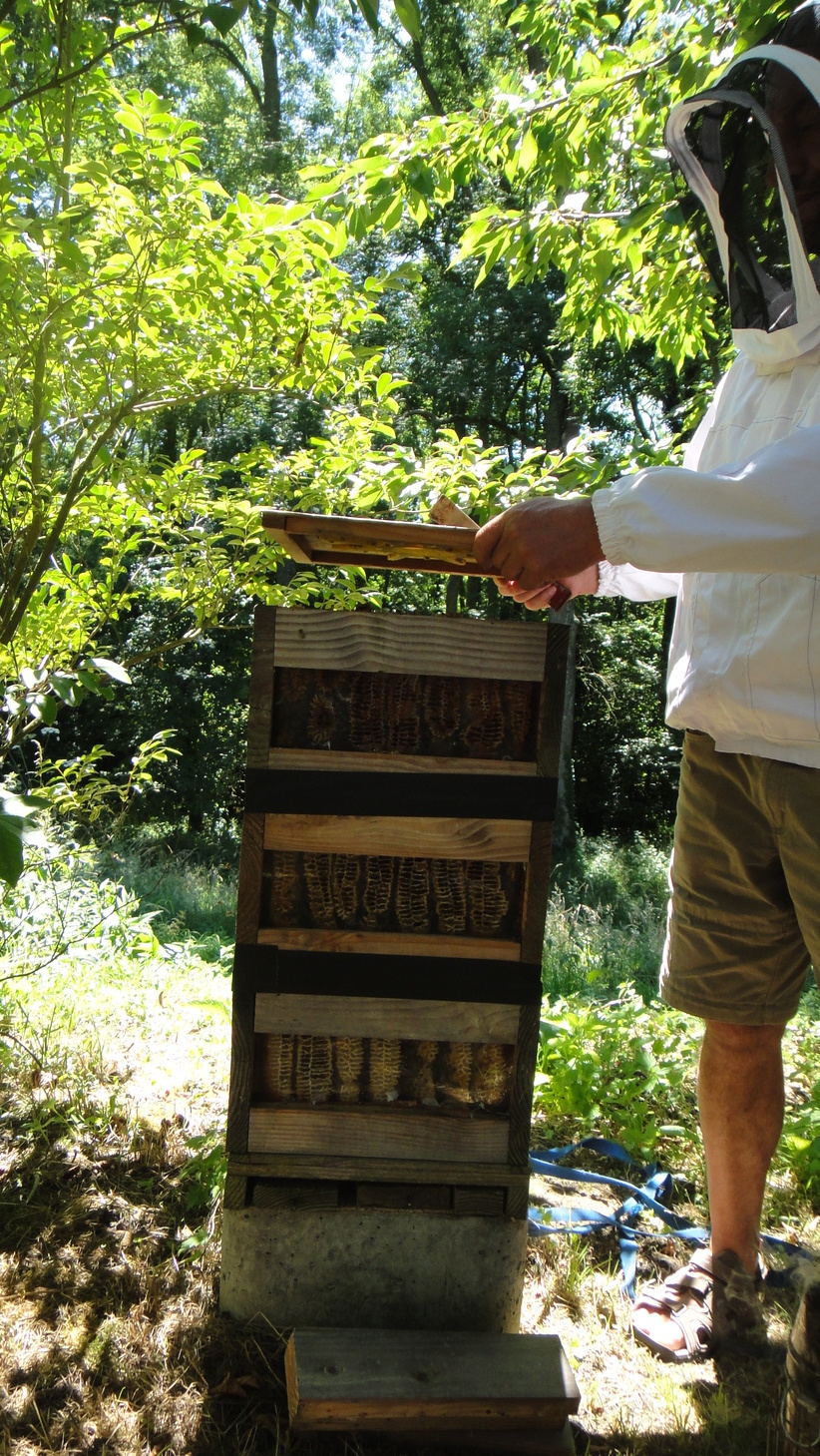 Le samedi 8 juillet 2017, j'ai assisté à une journée de stage sur l'apiculture naturelle avec la ruche Warré. Ce stage était animé par Olivier Duprez au rucher école de Gonneville-sur-Mer dans le Calvados. La journée s'est articulée autour d'une matinée de présentation de l'abeille, de son mode de vie et de la vie de la colonie durant une année. L'après-midi a été l'occasion de voir plusieurs types de ruches manipulées par Olivier: une Warré vitrée, une horizontale à cadres compatibles avec la Warré, une Mellifera. D'autres ruches étaient également visibles sur le rucher: ruche-tronc, ruche japonaise, ruche d'observation avec trois faces entièrement vitrées, Dadant écologique entre autres.