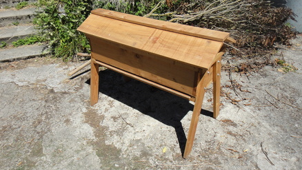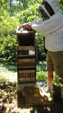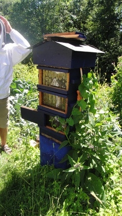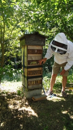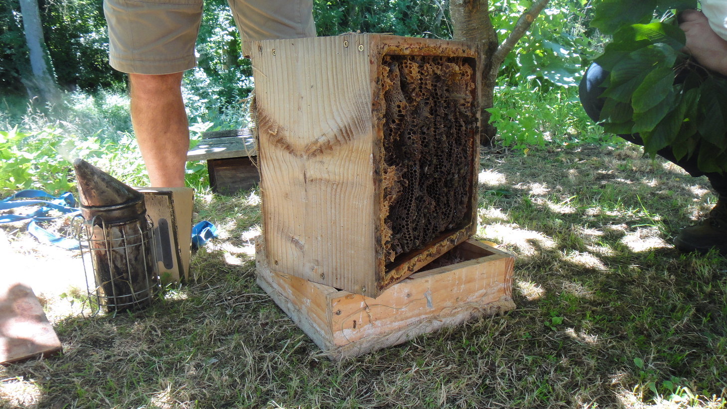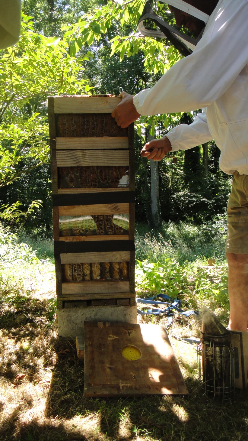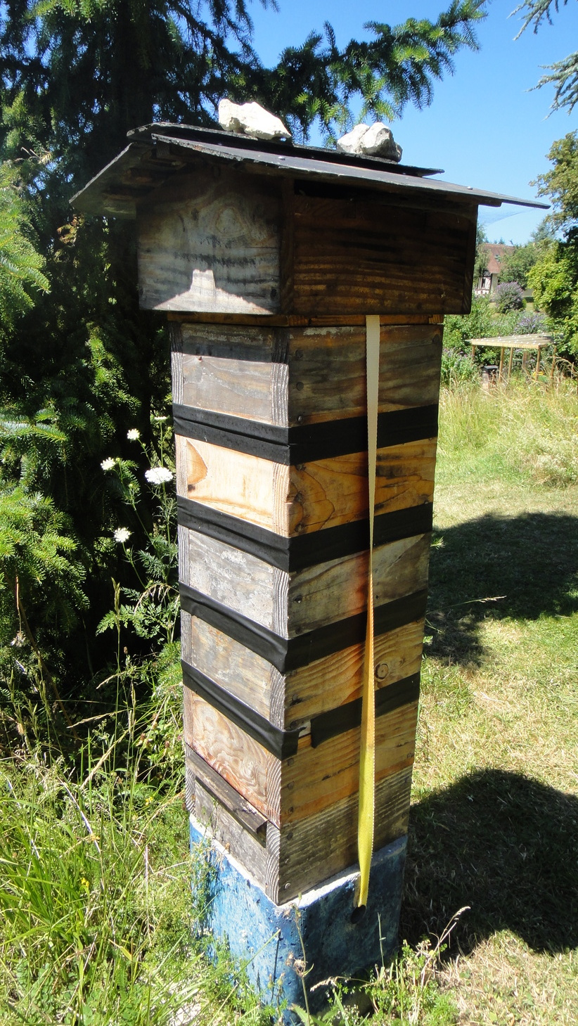 Avec la ruche Warré, la récolte se fait élément par élément. Ici, la ruche a 4 éléments et la récolte va se faire sur l'élément le plus haut.