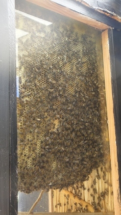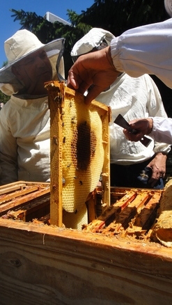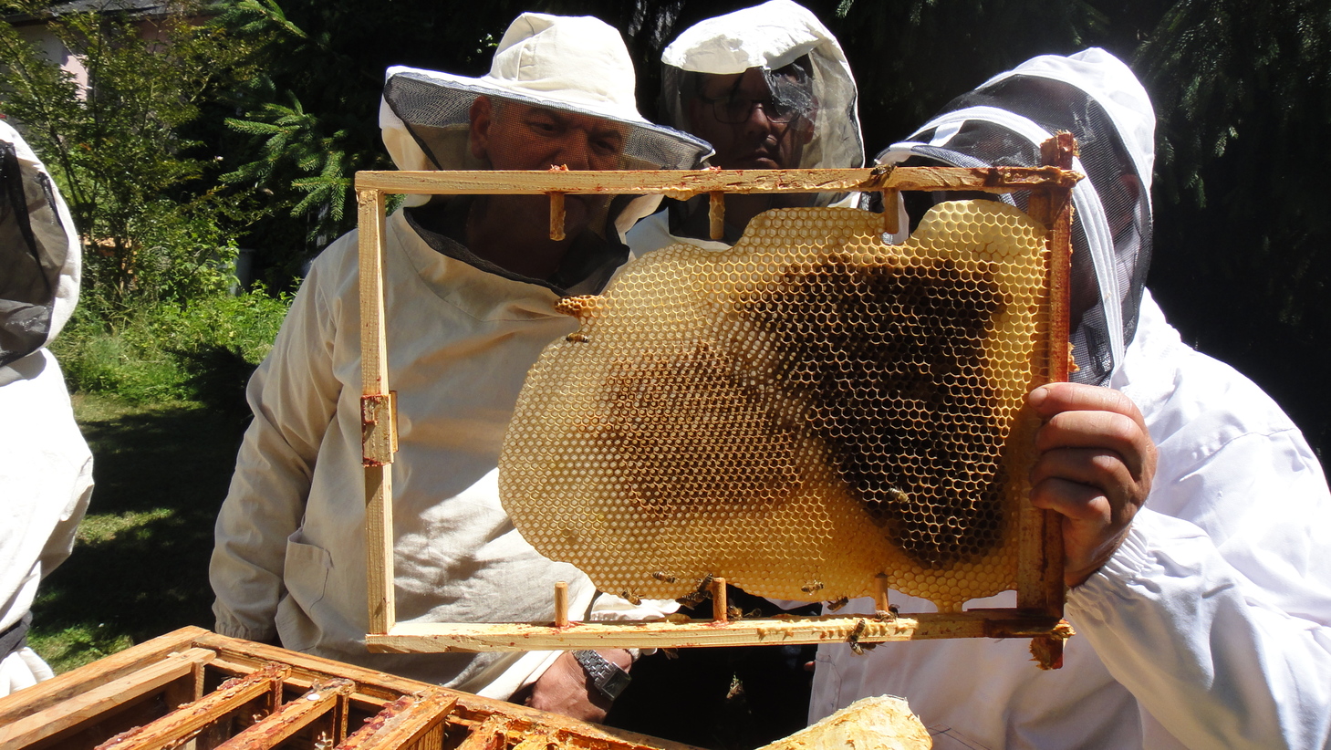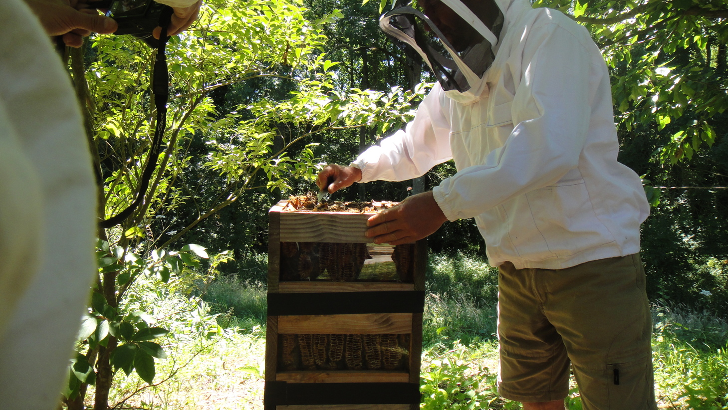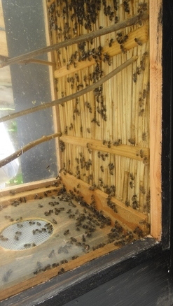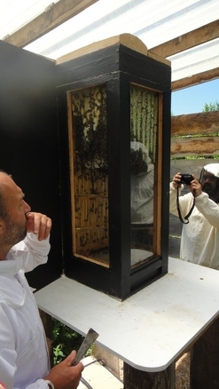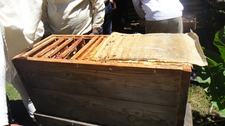 L'élément d'où sera récolté le miel est reposé sur le chasse-abeille.