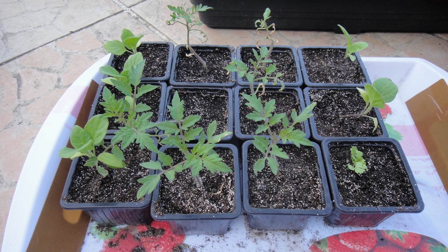 Pied de tomate cerise Black Cherry semé mi-février en intérieur et repiqué en pleine terre mi-avril, je le couvre avec le pot retourné en cas de gelée prévue la nuit: