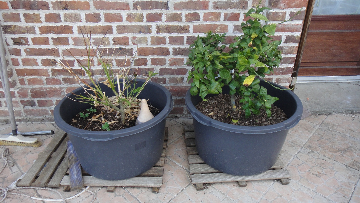 Agrumes de 2 ans et demi en bac: un citronnier de Pézenas avec des pois nains et un mandarinier satsuma Owari en boutons: