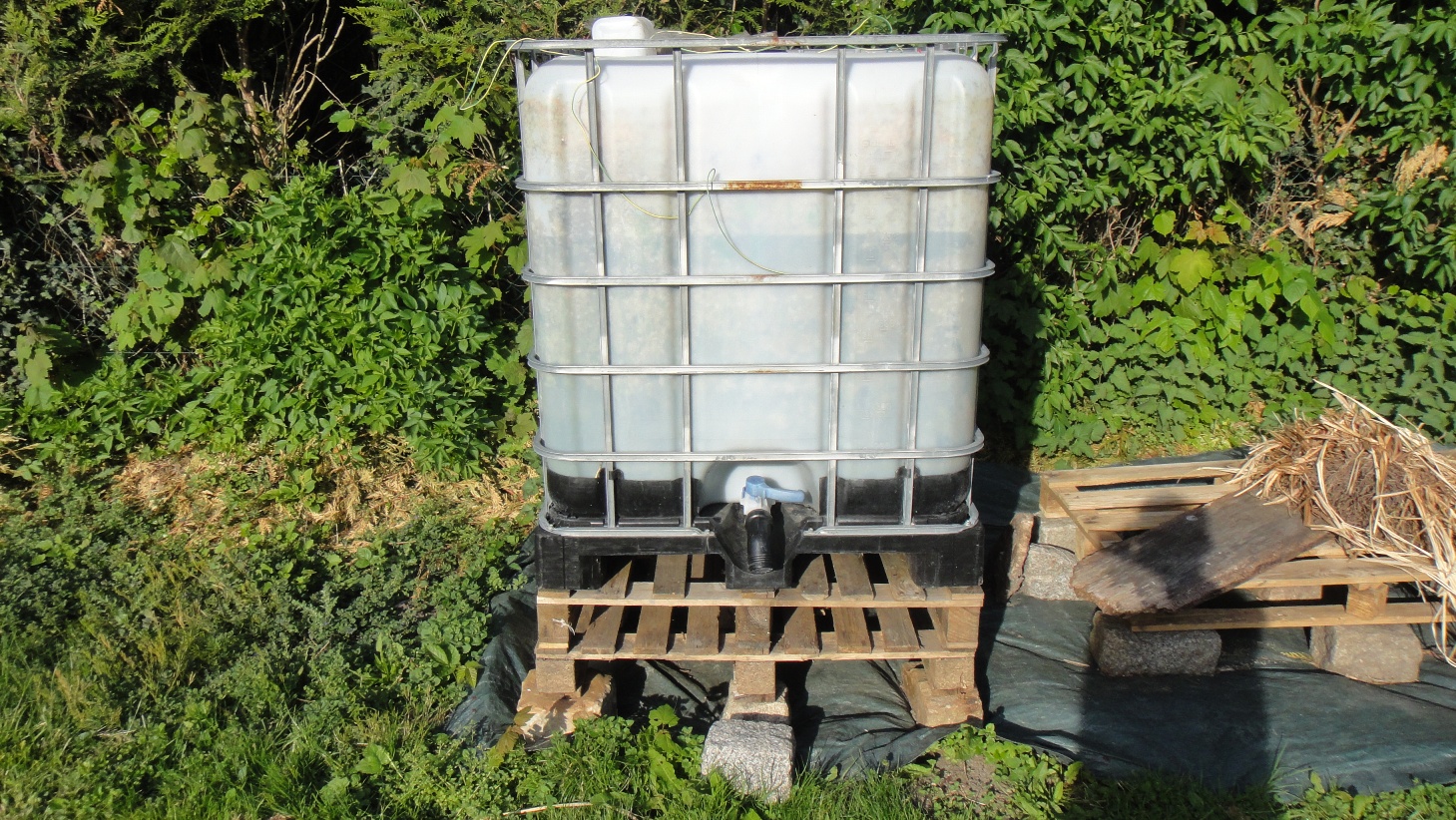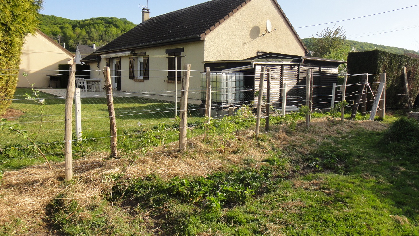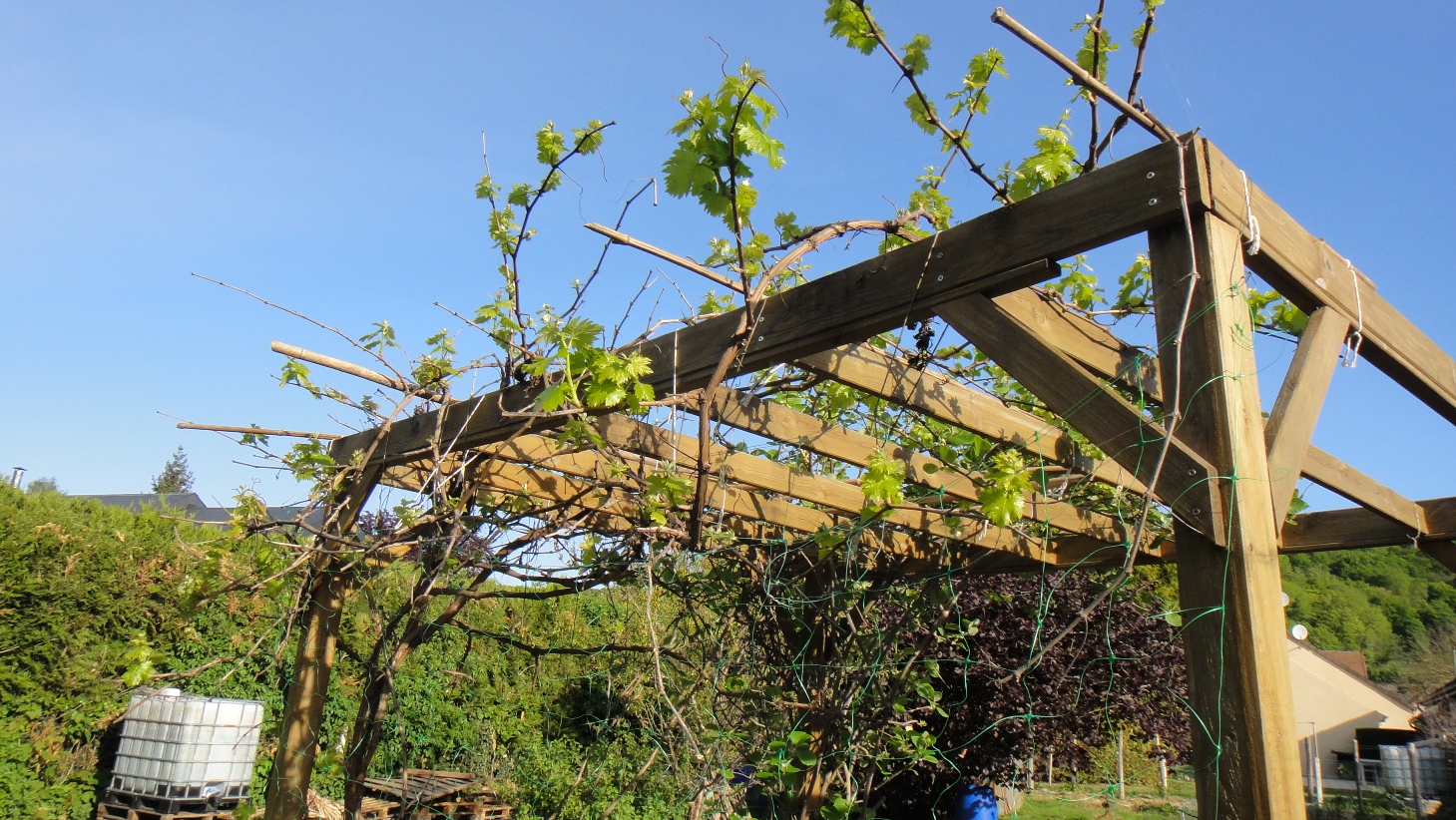 Un pied de vigne type Italia de 4 ans et demi sur la pergola, les tiges de bambou serviront à abriter les grappes à partir d'octobre pour limiter le pourrissement dû à l'humidité (cette variété mûrit en octobre chez nous):