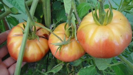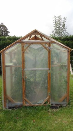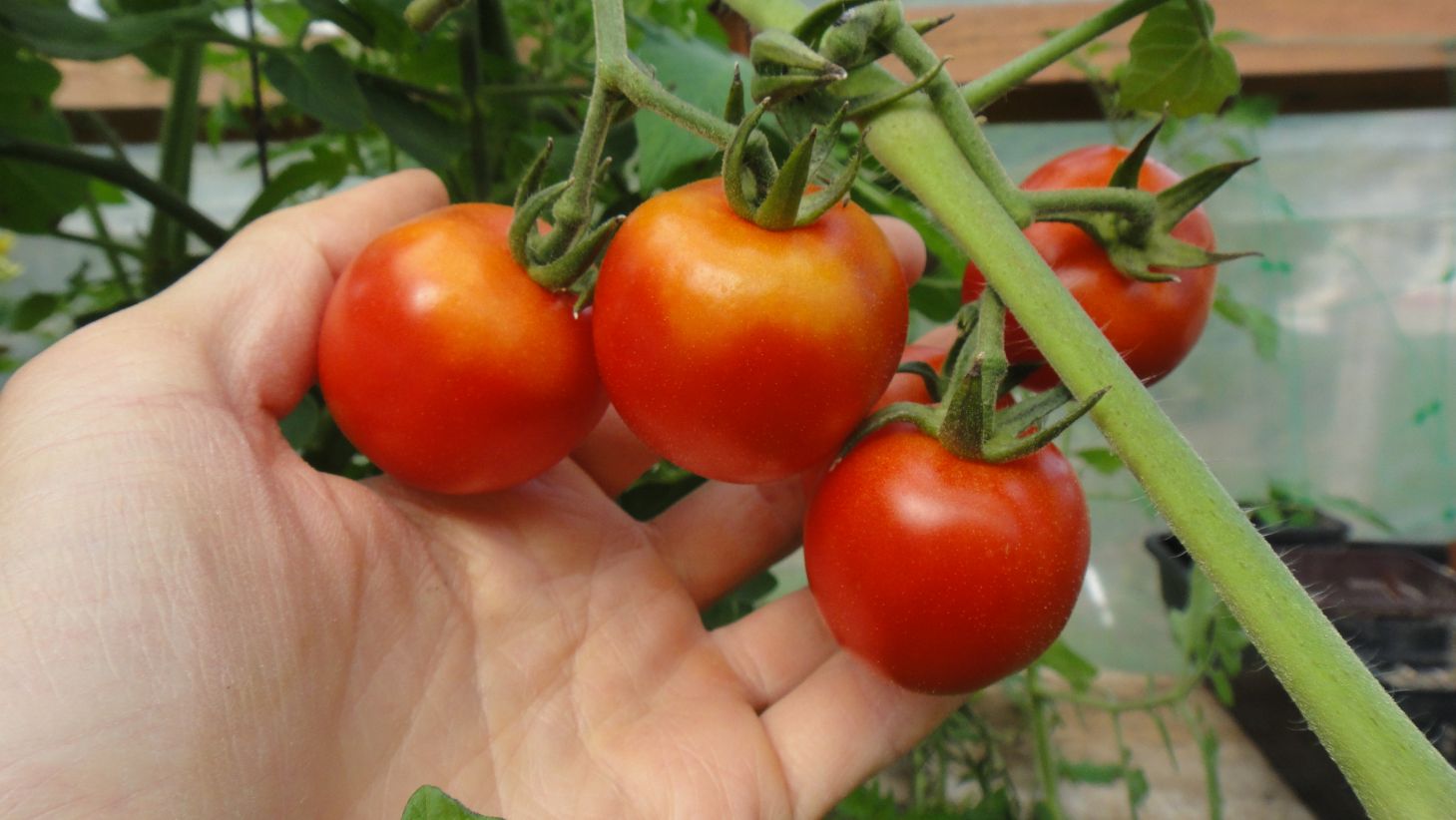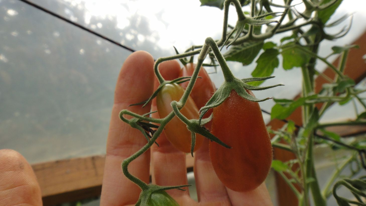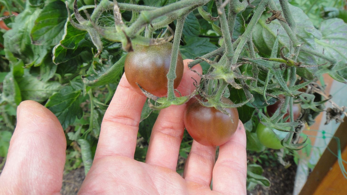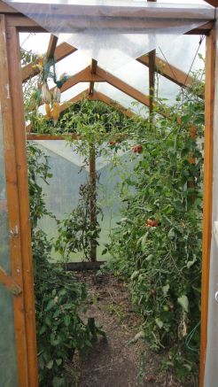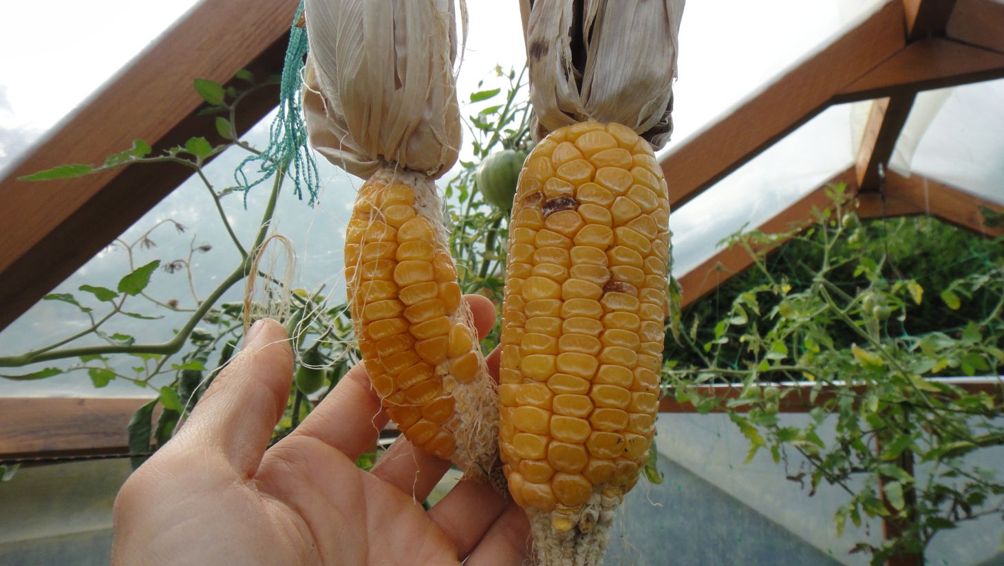 Dans la serre, tomates cerises Black Cherry, tomates cerises allongées (semis d'une variété achetée particulièrement goûteuse), maïs en cours de séchage, tomates moyennes et grosses, poivron: