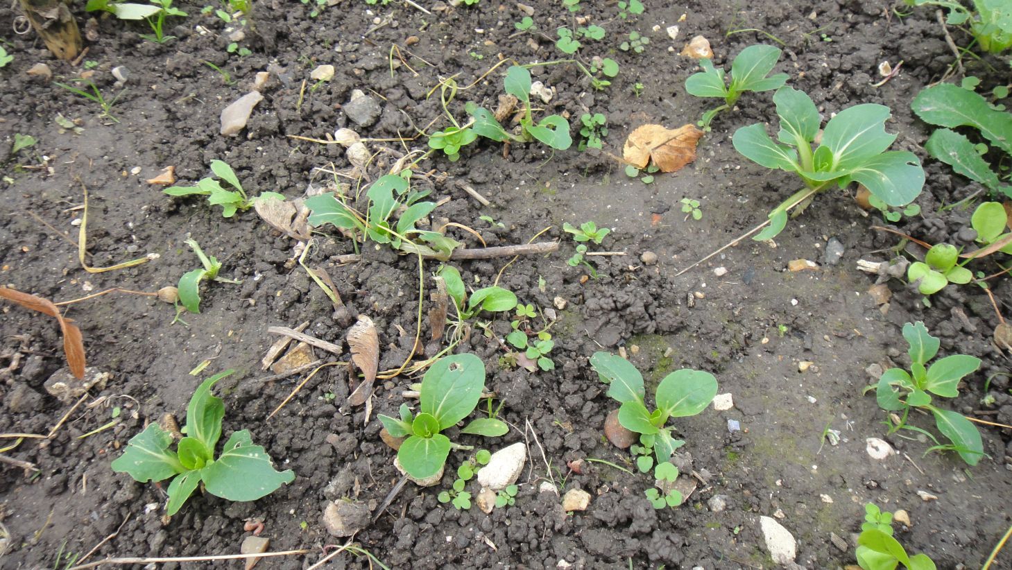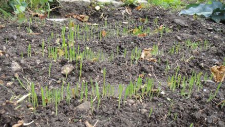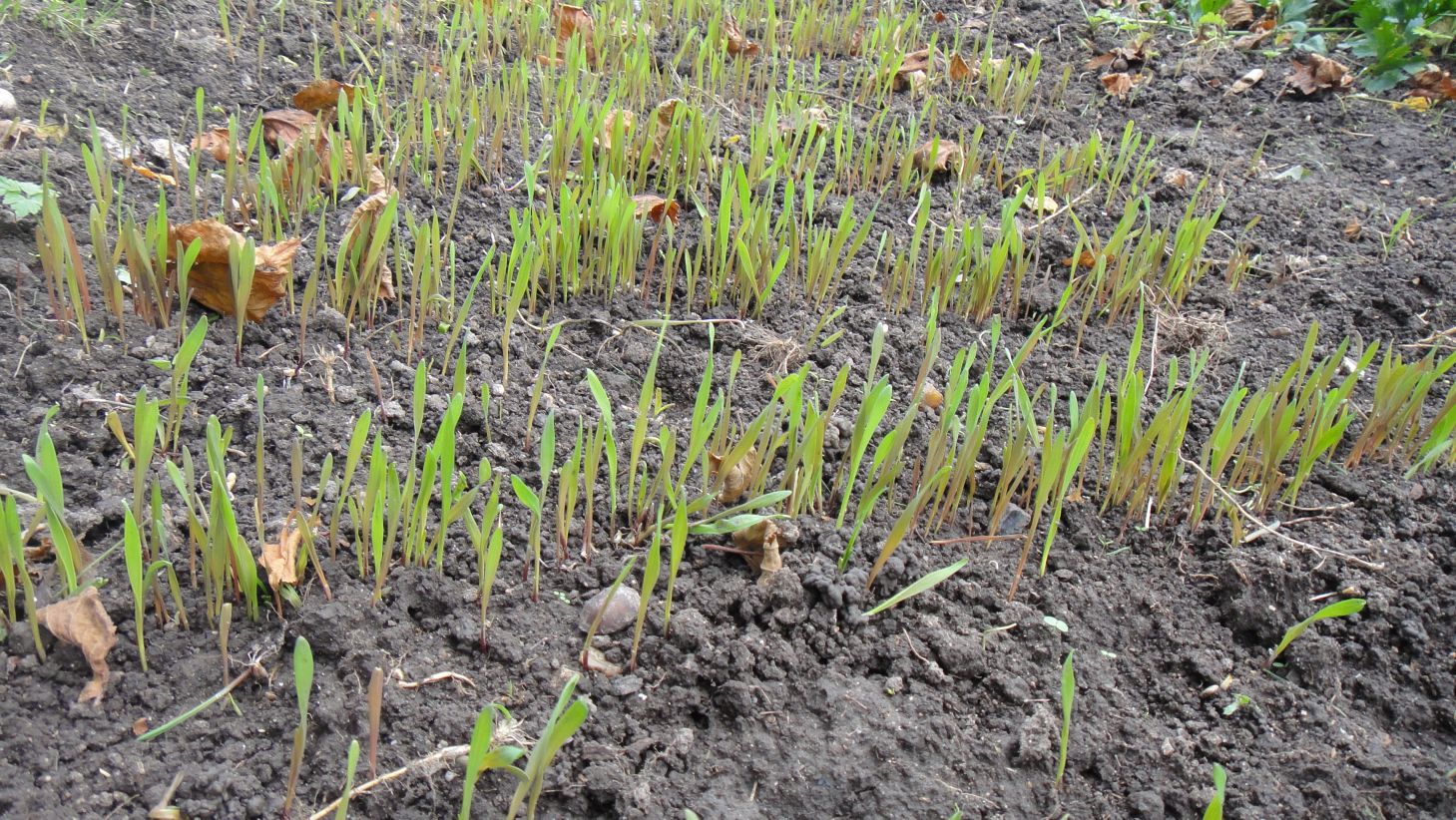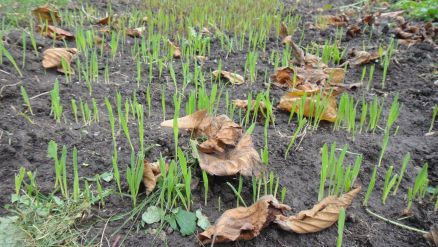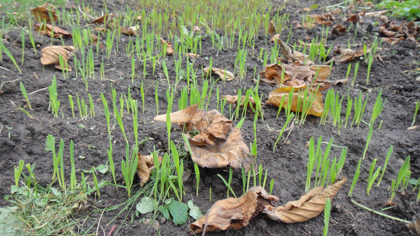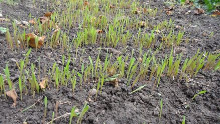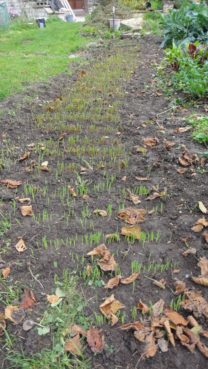 Céréales semées le 21 octobre: orge nue au premier plan, seigle ensuite puis avoine nue à l'arrière-plan: