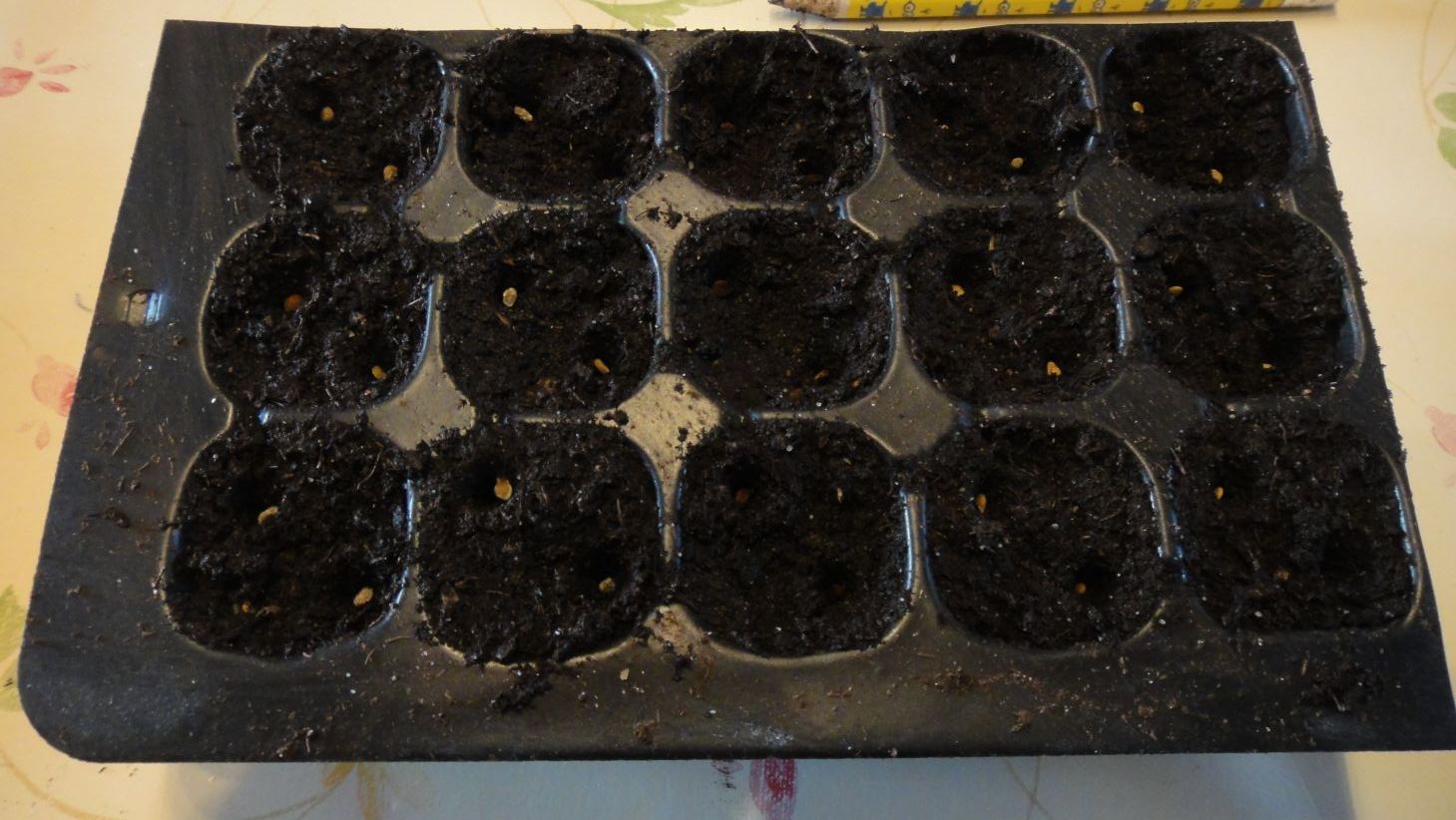 Semis des graines de tomates cerises en plaque à alvéoles avec du terreau de semis bien humide, à raison de 2 graines par alvéole: