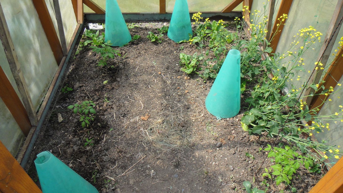 Serre abritant tomate, chou pak-choï nain en fleur et épinard: