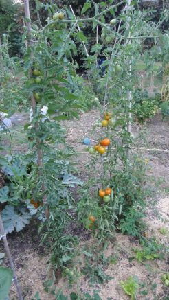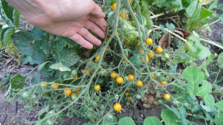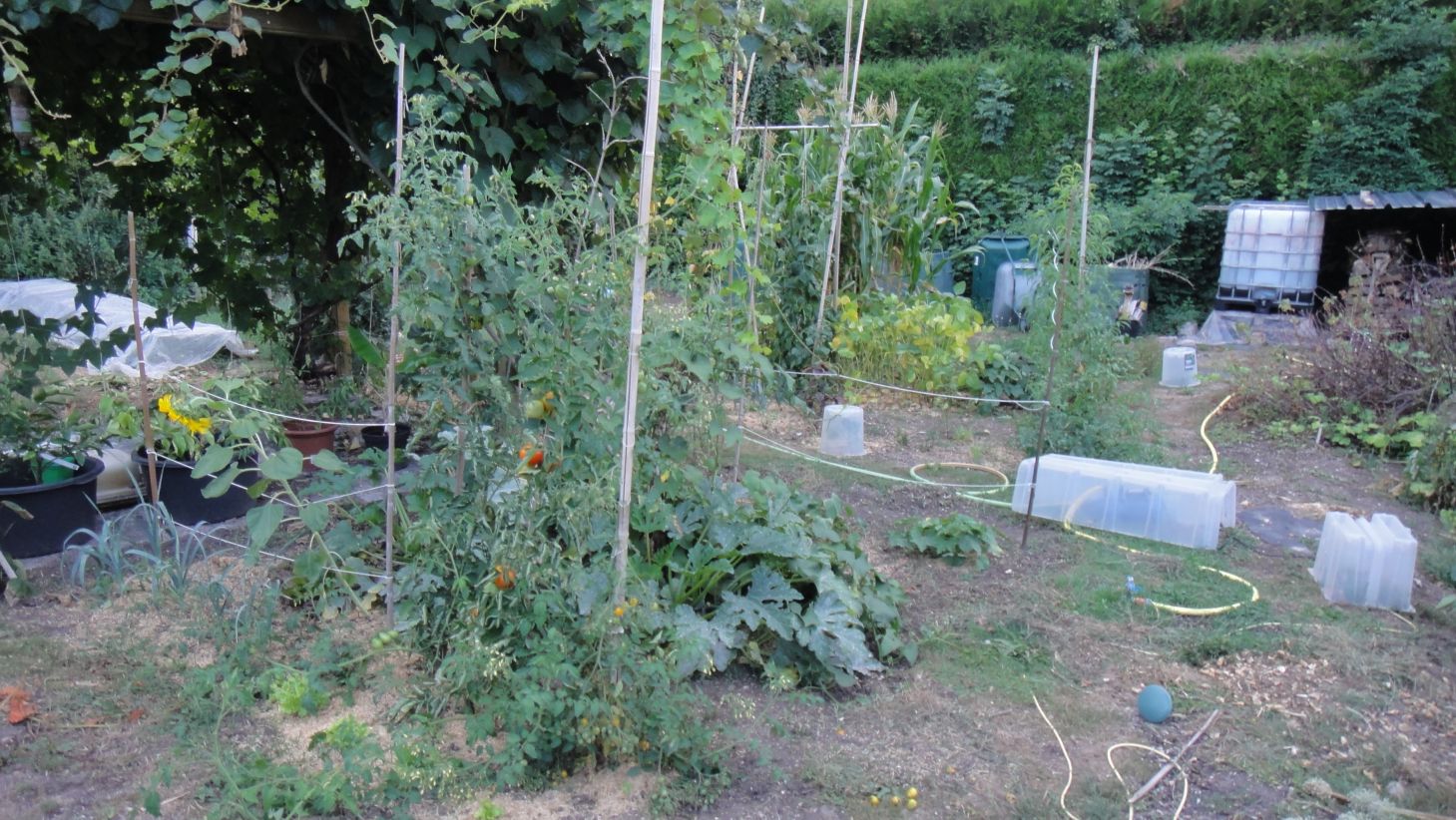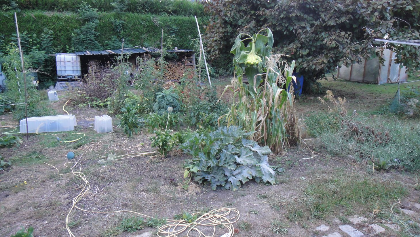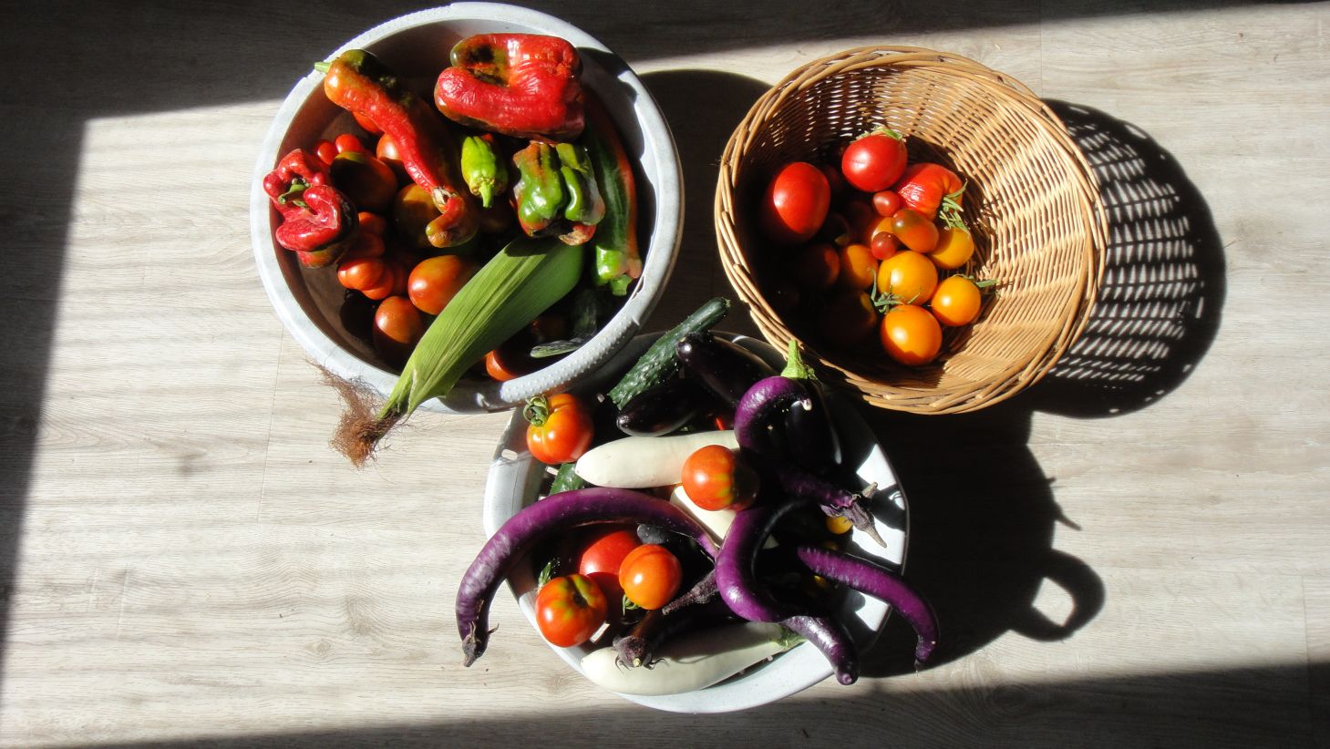 Récolte du potager: poivron, maïs, concombre, tomate et tomate-cerise, aubergine: