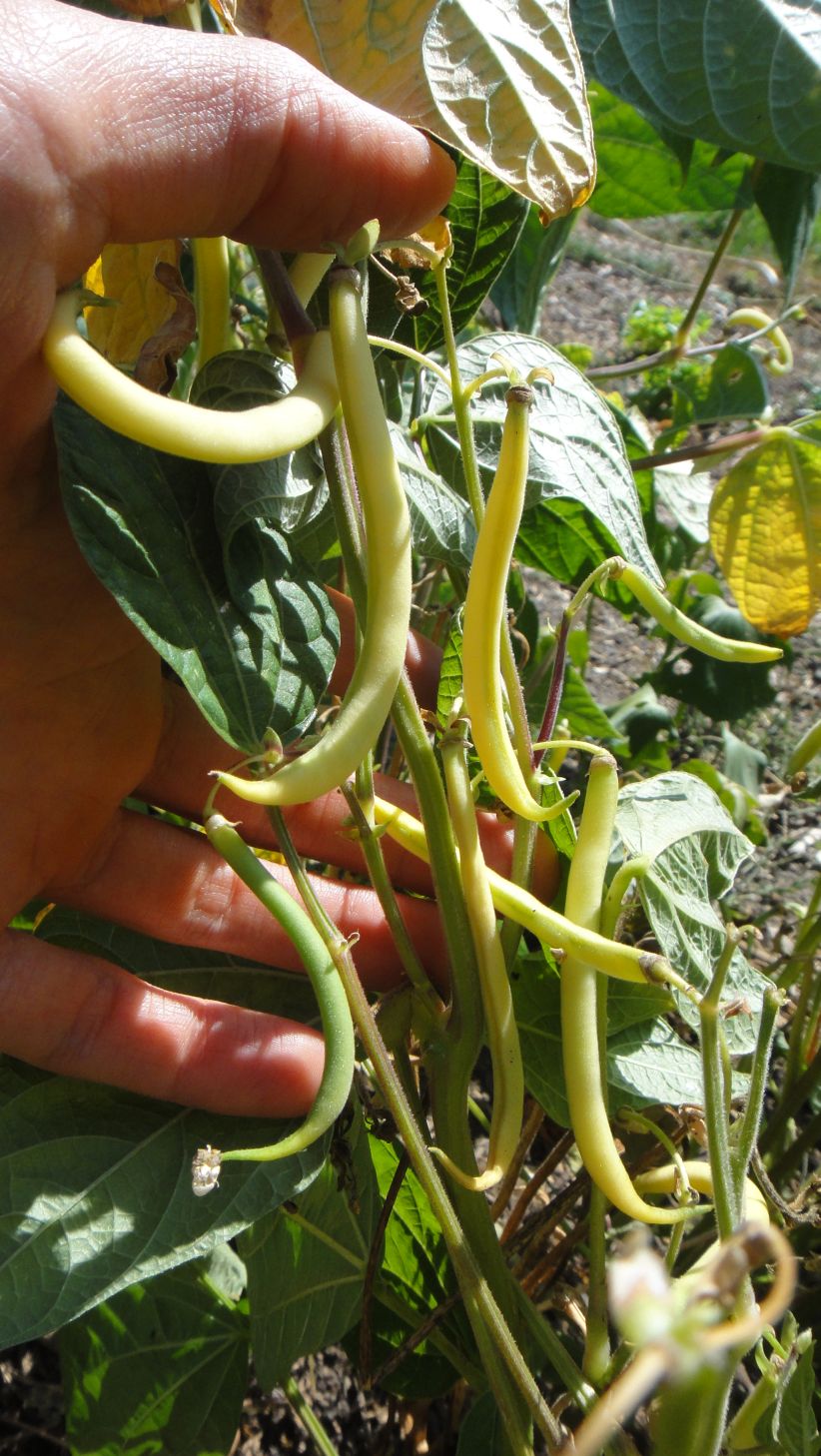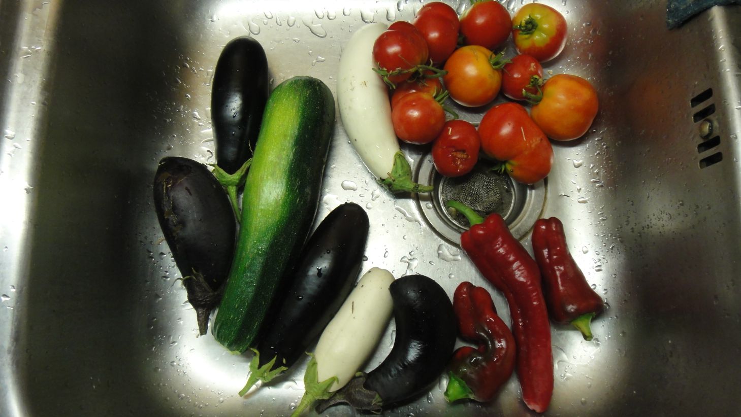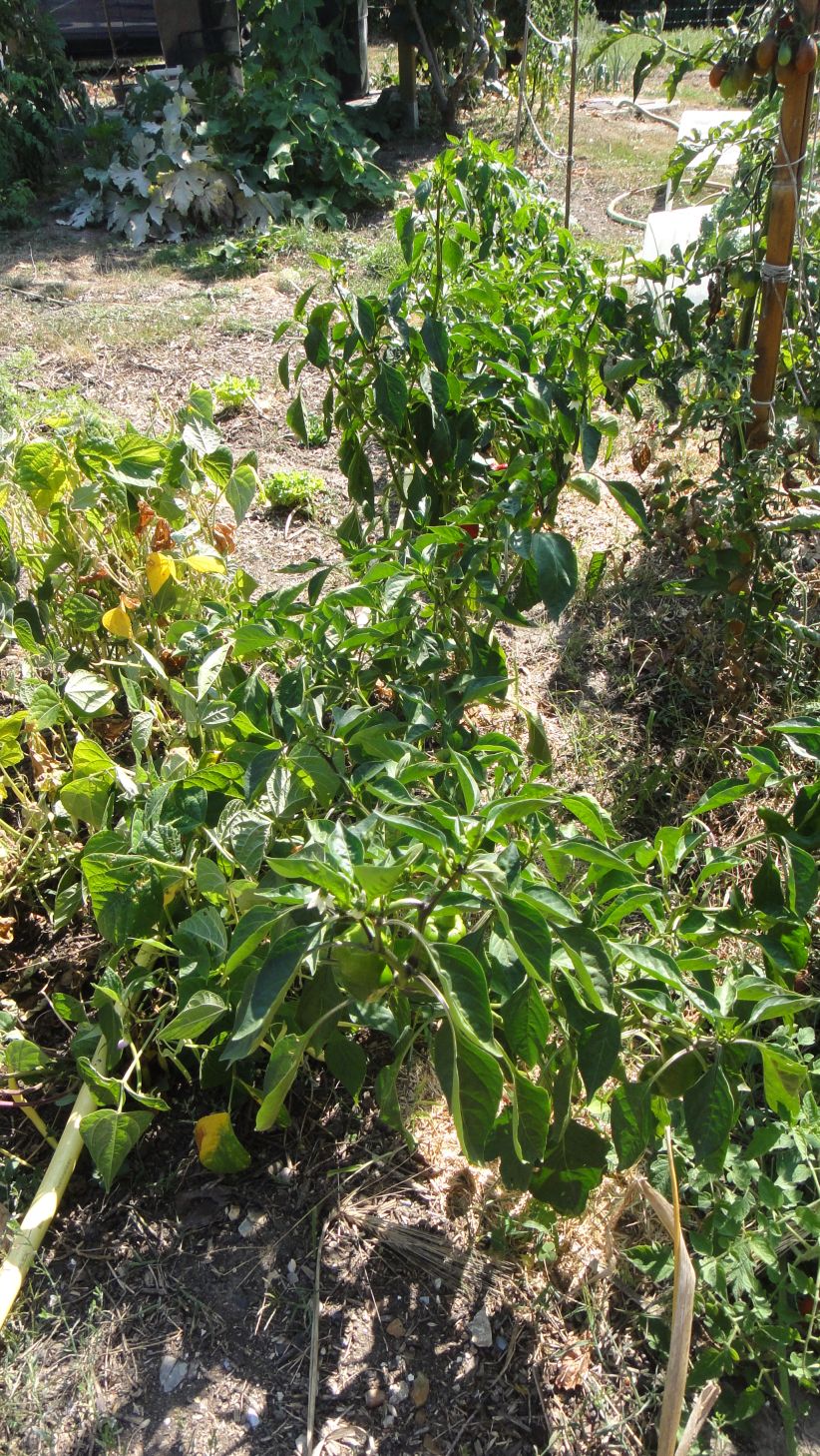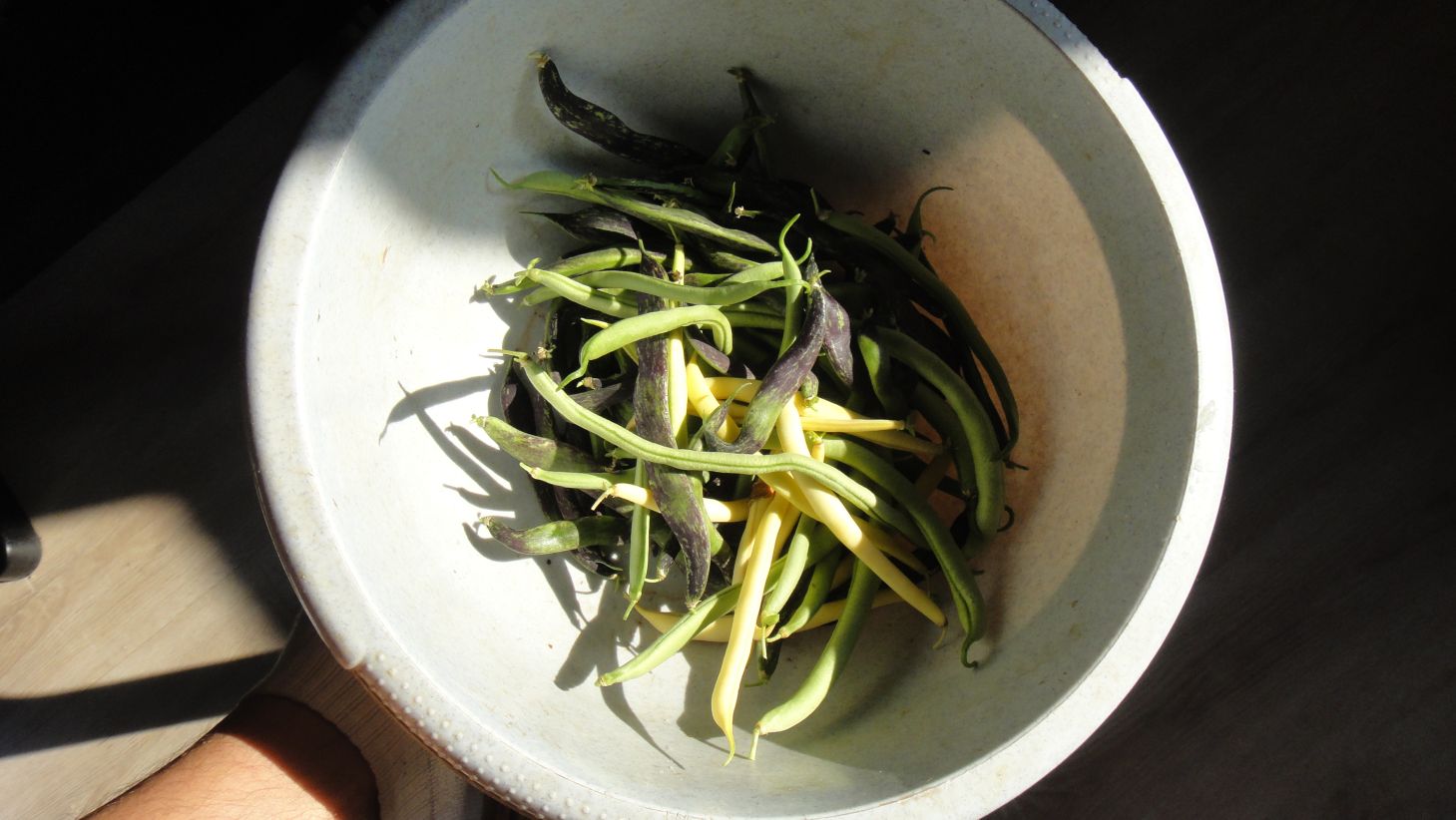 Récolte du potager: haricot, poivron, concombre, tomate et aubergine: