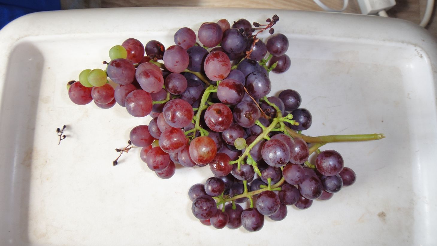 Première récolte de raisin sans pépin Flame seedless depuis sa plantation il y a 2 ans et demi contre le mur de la maison, abrité et exposé ouest: