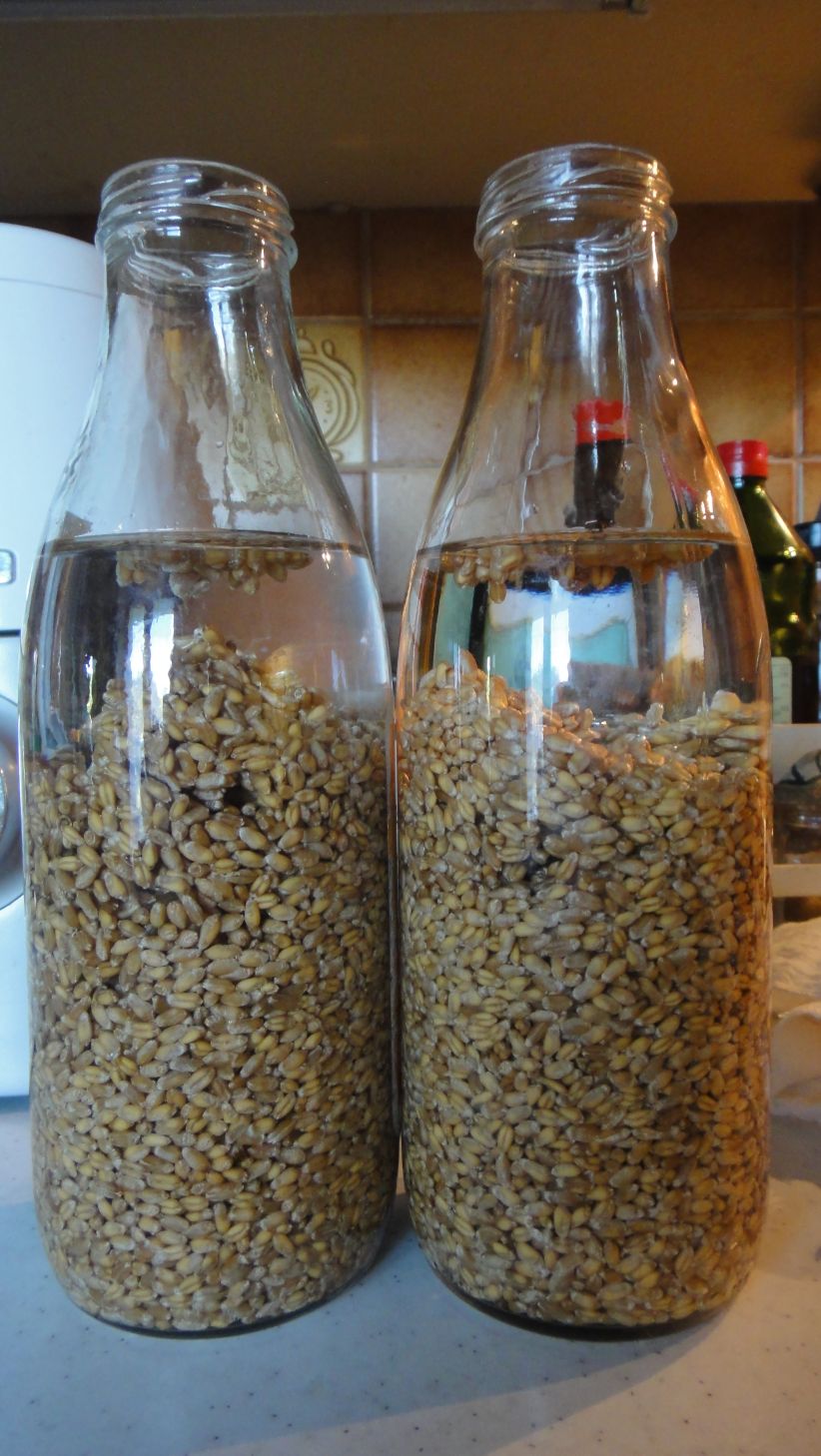Le soir du jour 1, je verse des grains de blé germable à la mi-hauteur d'un bocal en verre et les noie sous un volume d'eau suffisant.