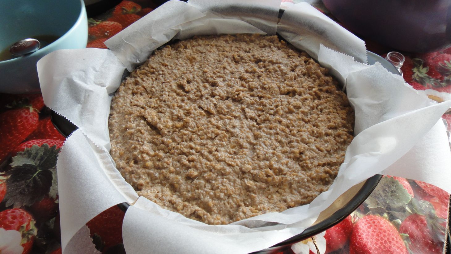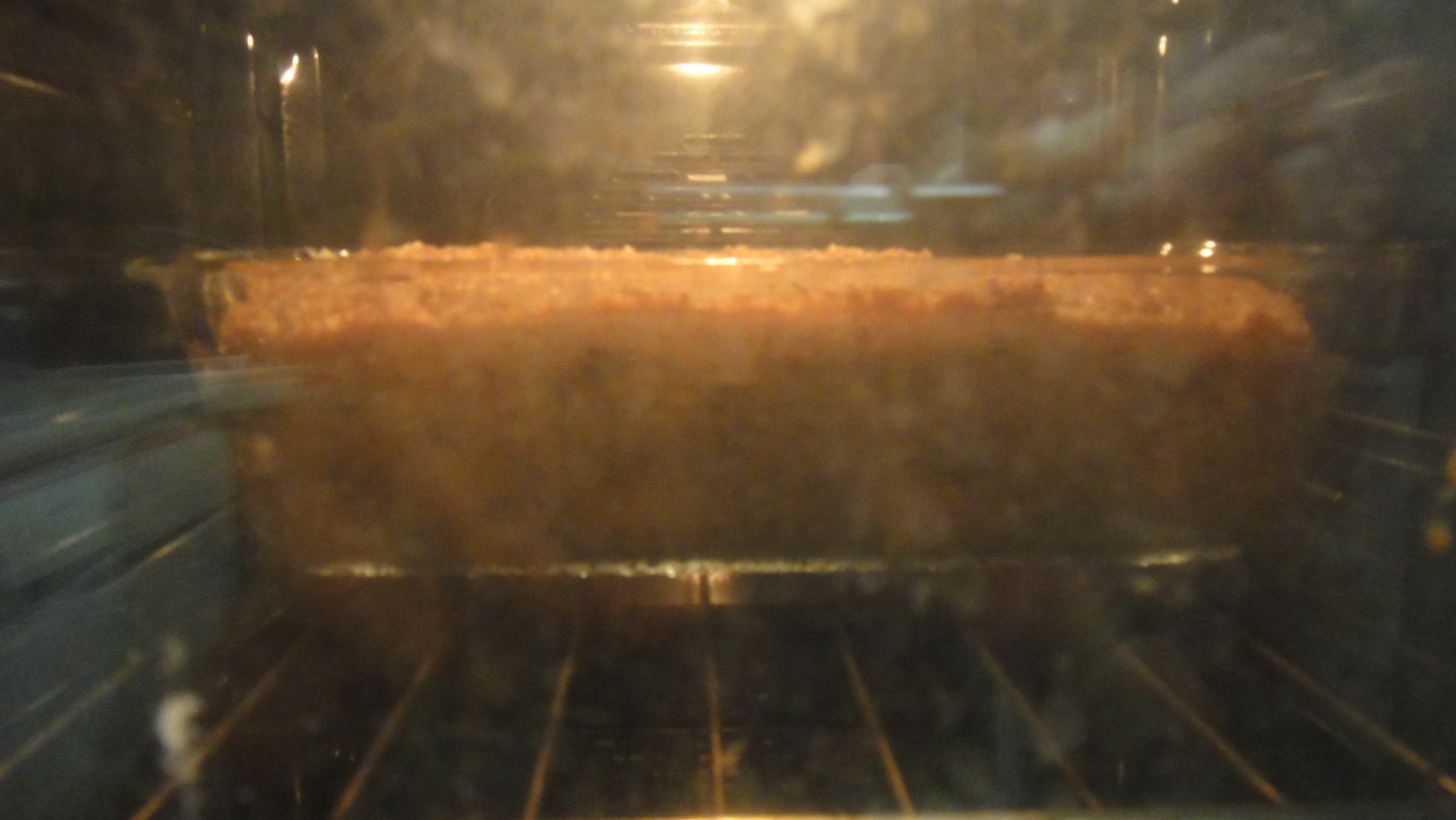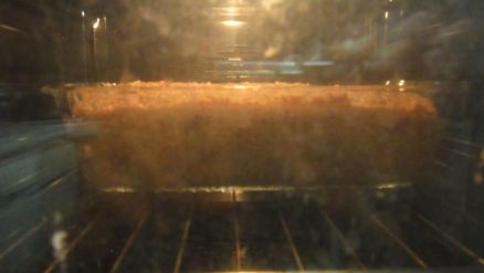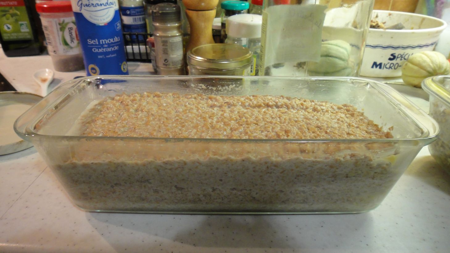 Je préchauffe alors mon four à 220 °C sans chaleur tournante. Je verse une partie de ces grains dans le bol de mon mixer avec un fond d'eau, les mixe à la vitesse maximale jusqu'à obtenir une pâte et verse cette pâte dans un moule à tarte à fond anti-adhésif. Je recommence ainsi pour le reste des grains. Je lisse ensuite la pâte versée et je couvre le moule d'un plat à pizza. J'introduis un bol d'eau en bas du four et le moule couvert au milieu. Je baisse la température à 100 °C une fois la porte fermée.