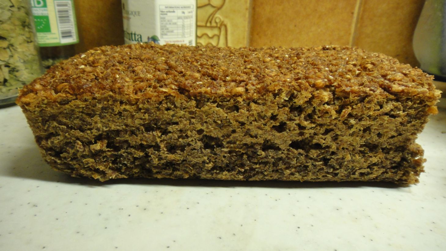 Le pumpernickel est un pain cuit longuement à température modérée ce qui produit sa couleur brune et sa saveur sucrée. Ma recette utilise de l'eau et du grain germable de céréale (ici du blé).